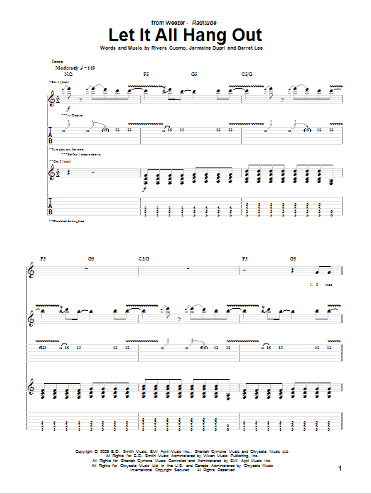 Download or print Weezer Let It All Hang Out sheet music, chords and digital score arranged for Guitar Tab. This Alternative score includes 8 page(s).