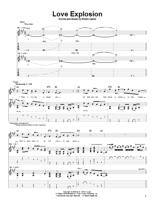 Download or print Weezer Love Explosion sheet music, chords and digital score arranged for Guitar Tab. This Rock score includes 5 page(s).