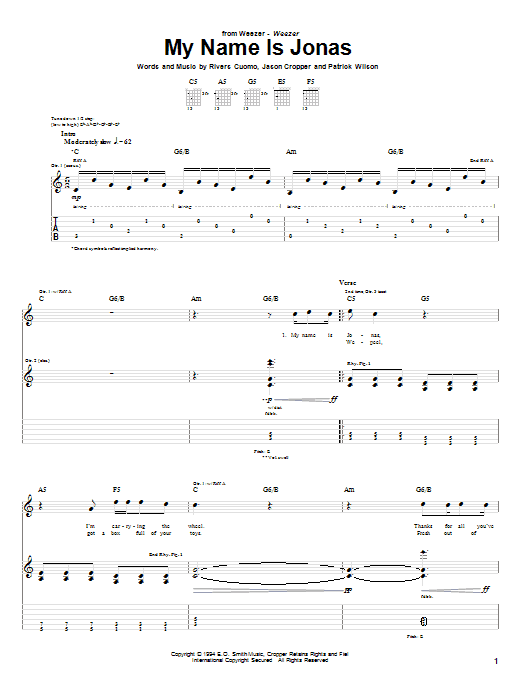 Download or print Weezer My Name Is Jonas sheet music, chords and digital score arranged for Piano, Vocal & Guitar Chords (Right-Hand Melody). This Alternative score includes 7 page(s).