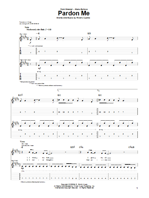 Download or print Weezer Pardon Me sheet music, chords and digital score arranged for Guitar Tab. This Alternative score includes 7 page(s).