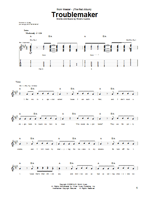 Download or print Weezer Troublemaker sheet music, chords and digital score arranged for Guitar Tab. This Pop score includes 7 page(s).