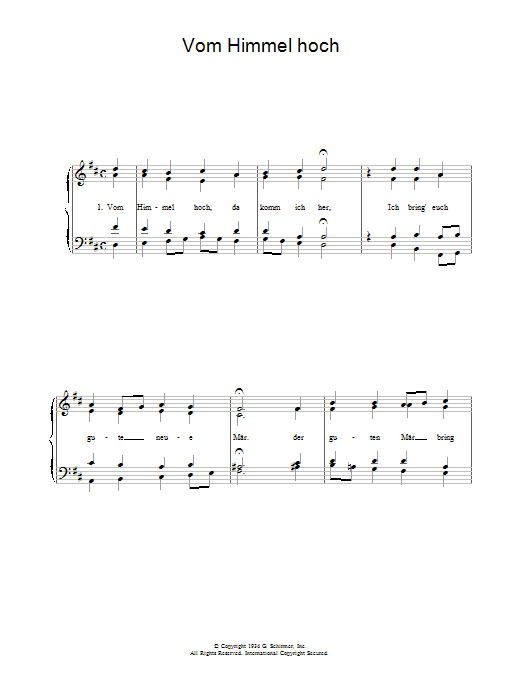 Download or print Christmas Carol Vom Himmel Hoch sheet music, chords and digital score arranged for Piano, Vocal & Guitar Chords. This Christmas score includes 2 page(s).