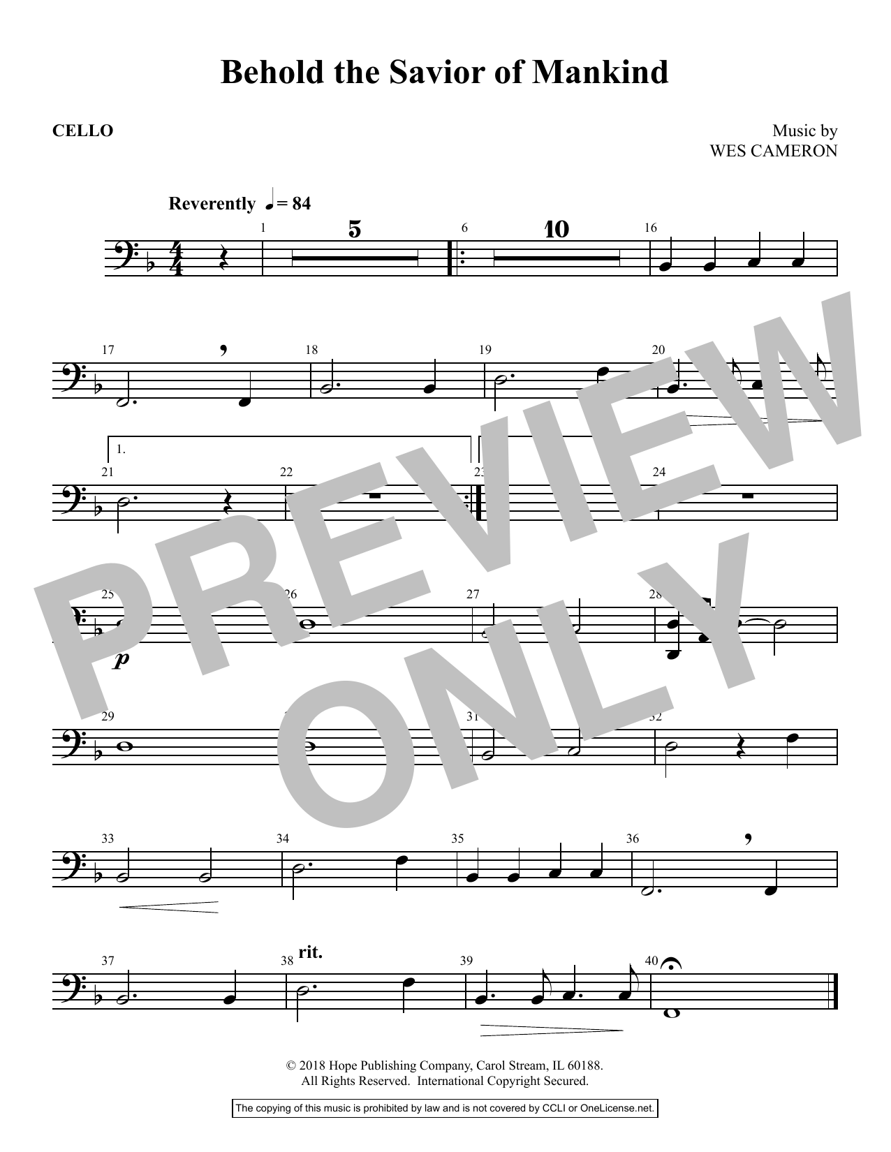 Download or print Wes Cameron Behold the Savior of Mankind - Cello sheet music, chords and digital score arranged for Choir Instrumental Pak. This Sacred score includes 1 page(s).