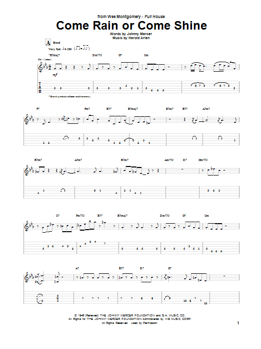 Download or print Wes Montgomery Come Rain Or Come Shine sheet music, chords and digital score arranged for Guitar Tab. This Jazz score includes 9 page(s).