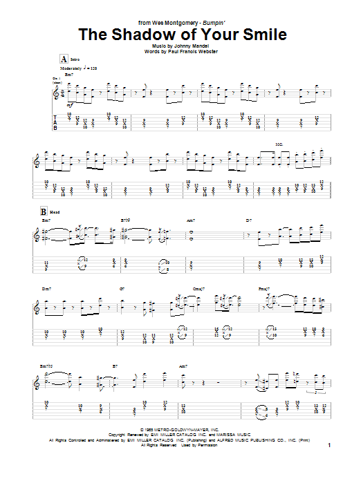 Download or print Wes Montgomery The Shadow Of Your Smile sheet music, chords and digital score arranged for Guitar Tab. This Jazz score includes 3 page(s).