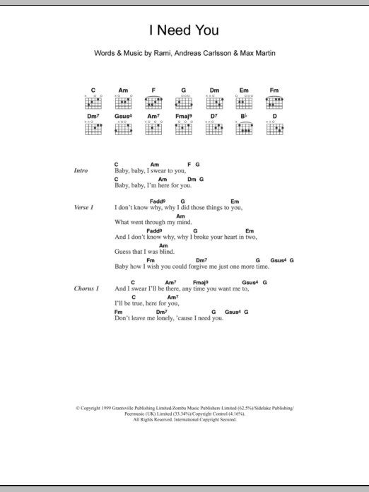 Download or print Westlife I Need You sheet music, chords and digital score arranged for Guitar Chords/Lyrics. This Pop score includes 2 page(s).