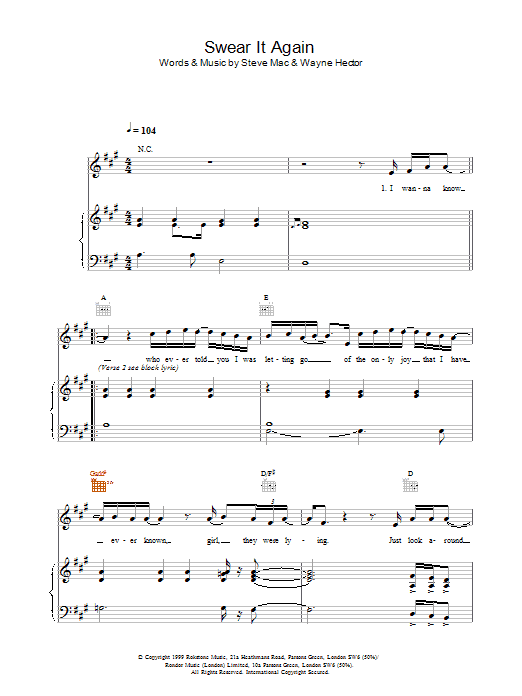 Download or print Westlife Swear It Again sheet music, chords and digital score arranged for Piano Chords/Lyrics. This Pop score includes 2 page(s).