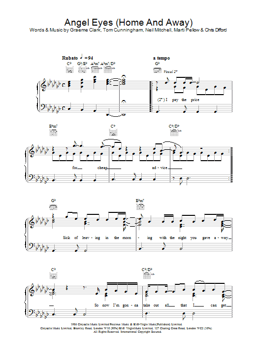 Download or print Wet Wet Wet Angel Eyes (Home And Away) sheet music, chords and digital score arranged for Guitar Chords/Lyrics. This Pop score includes 2 page(s).