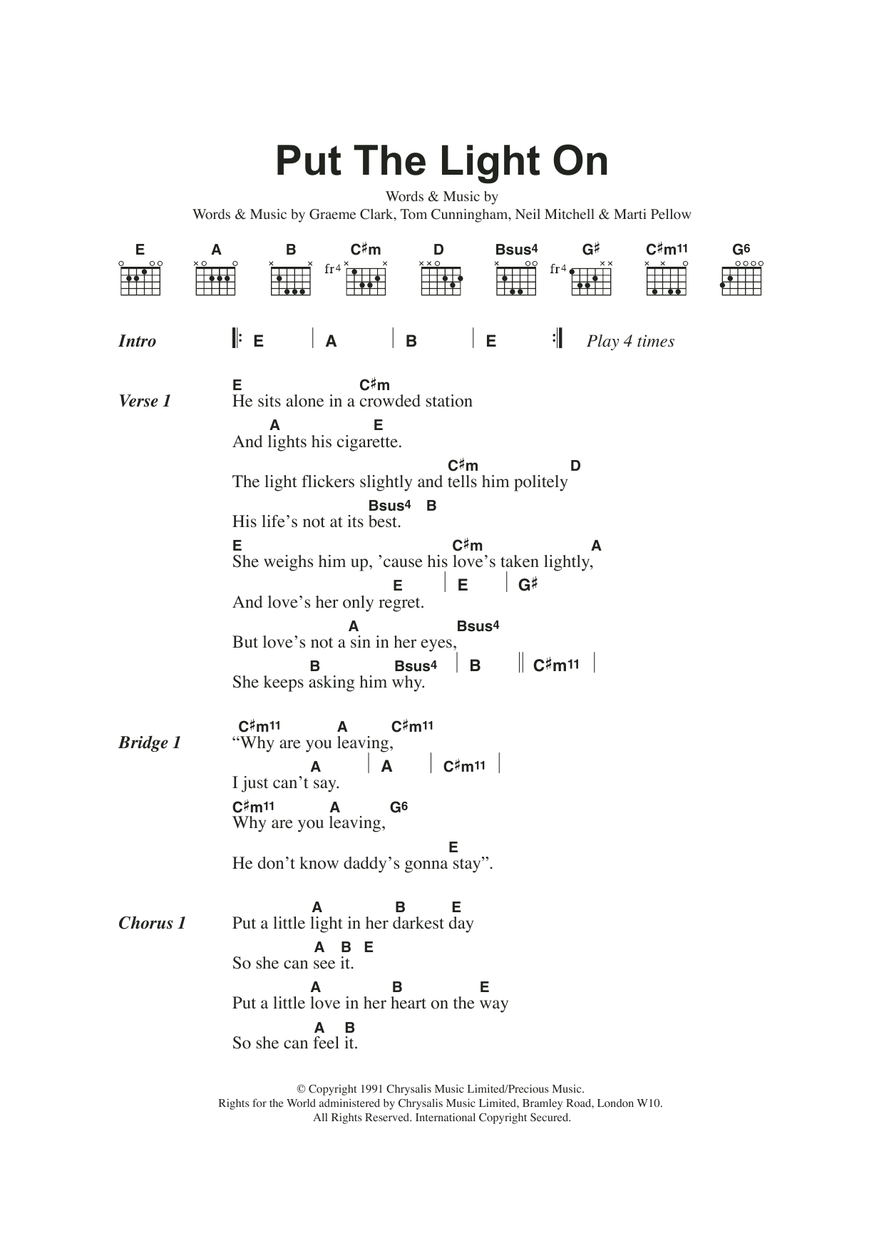 Download or print Wet Wet Wet Put The Light On sheet music, chords and digital score arranged for Guitar Chords/Lyrics. This Pop score includes 2 page(s).
