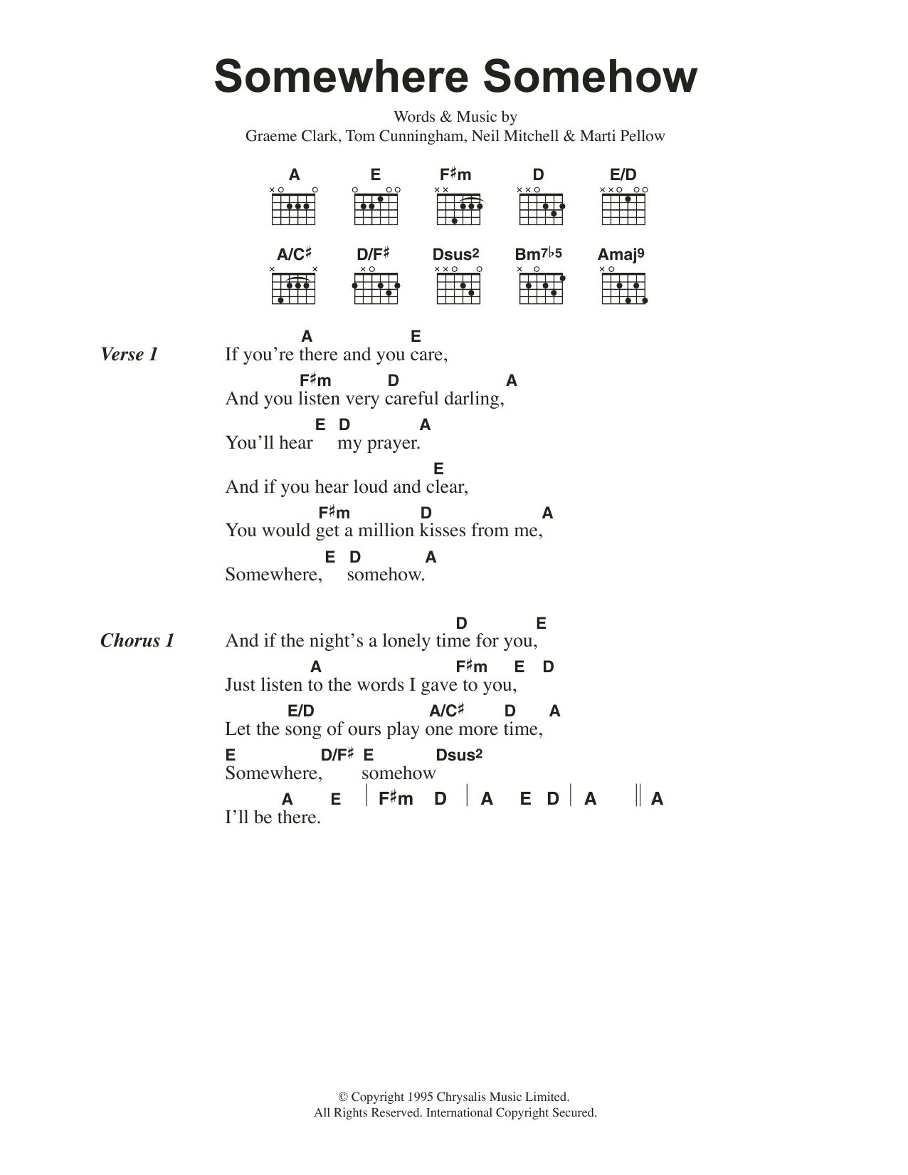 Download or print Wet Wet Wet Somewhere Somehow sheet music, chords and digital score arranged for Guitar Chords/Lyrics. This Pop score includes 2 page(s).