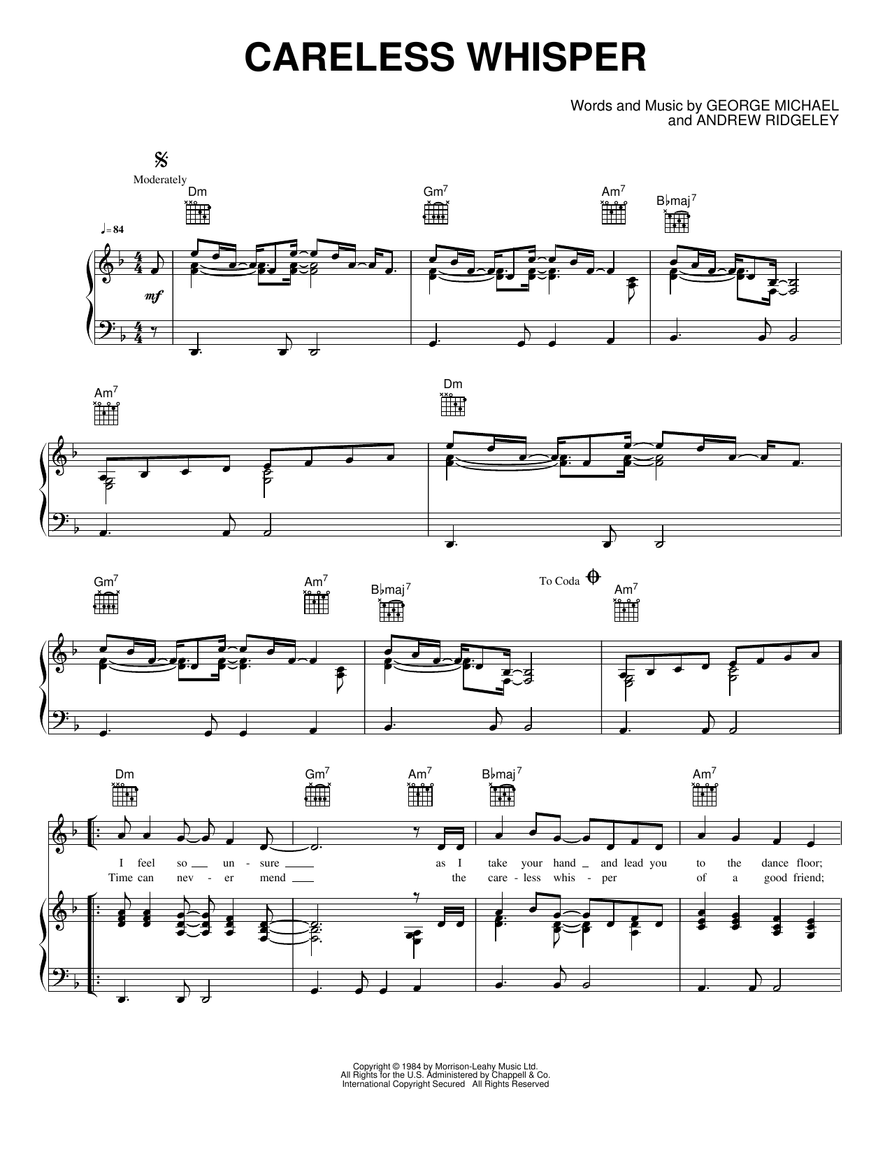 Download or print Wham! Careless Whisper sheet music, chords and digital score arranged for Piano, Vocal & Guitar Chords (Right-Hand Melody). This Pop score includes 5 page(s).