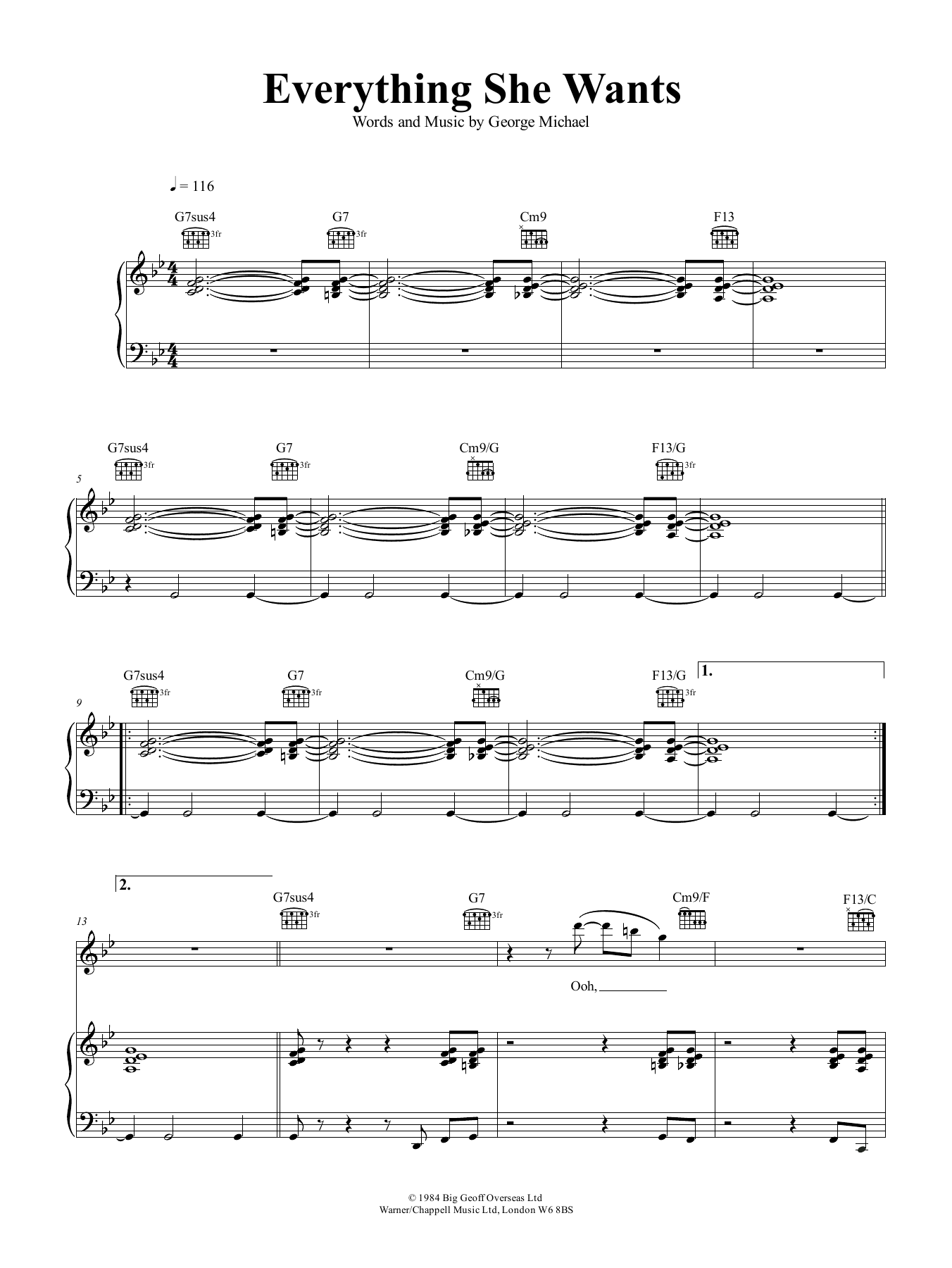 Download or print Wham! Everything She Wants sheet music, chords and digital score arranged for Piano, Vocal & Guitar Chords (Right-Hand Melody). This Pop score includes 10 page(s).