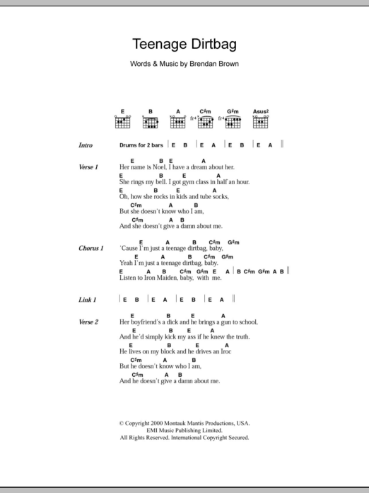 Download or print Wheatus Teenage Dirtbag sheet music, chords and digital score arranged for Guitar Chords/Lyrics. This Rock score includes 2 page(s).