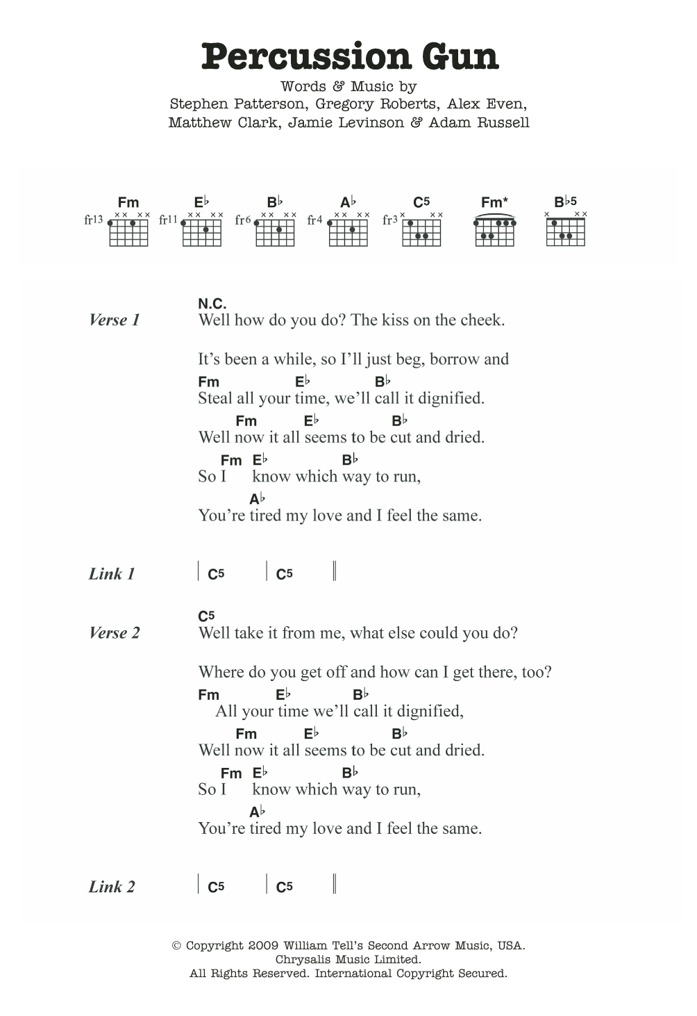 Download or print White Rabbits Percussion Gun sheet music, chords and digital score arranged for Guitar Chords/Lyrics. This Rock score includes 2 page(s).