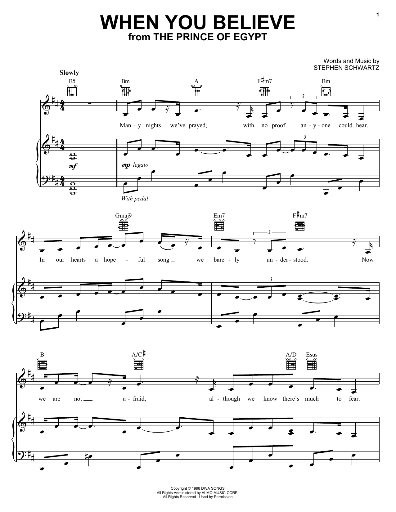 Download or print Whitney Houston and Mariah Carey When You Believe (from The Prince Of Egypt) sheet music, chords and digital score arranged for Easy Piano. This Children score includes 6 page(s).