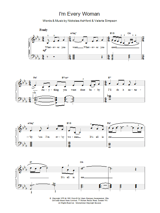 Download or print Whitney Houston I'm Every Woman sheet music, chords and digital score arranged for Piano, Vocal & Guitar Chords. This Pop score includes 5 page(s).