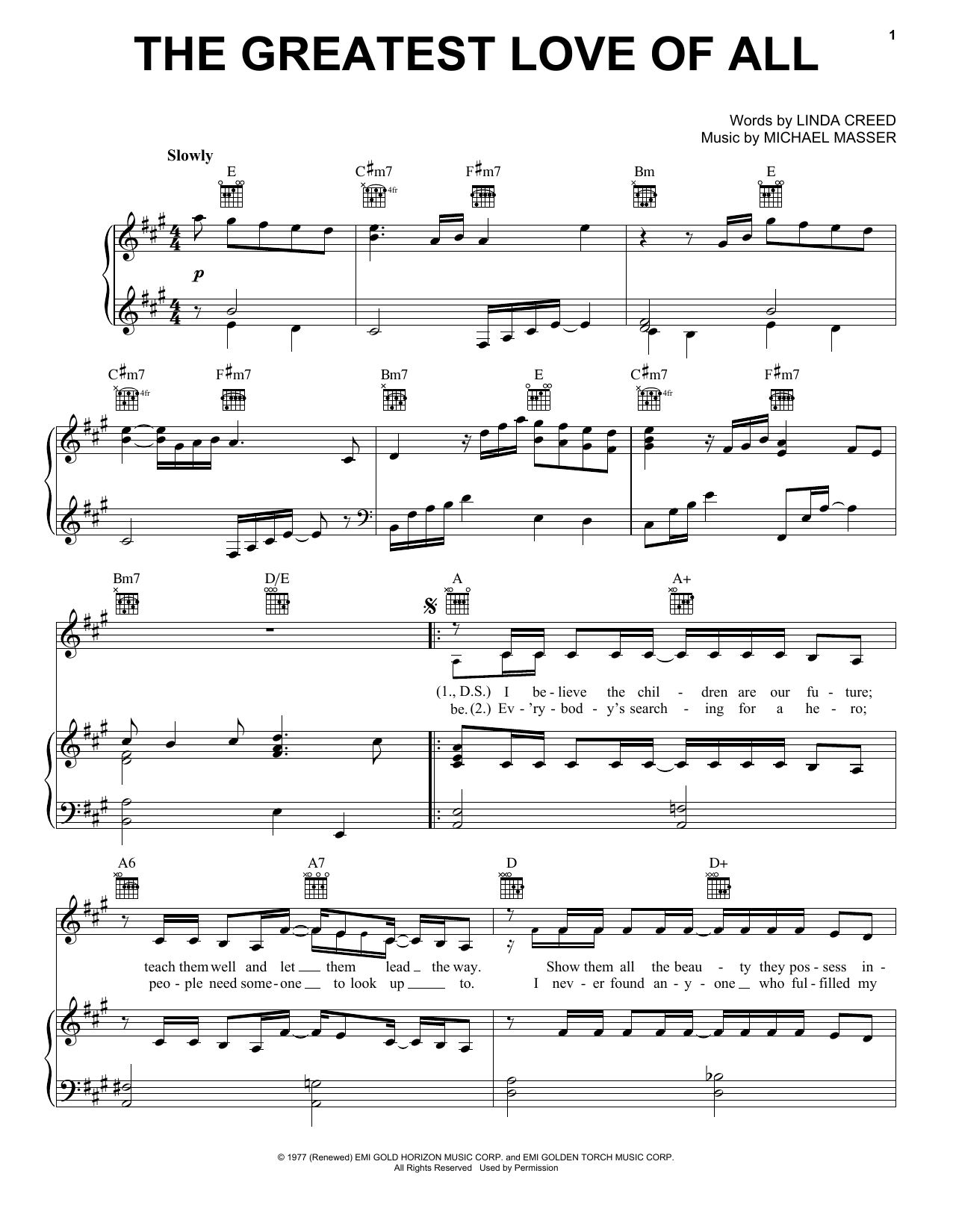Download or print Michael Masser The Greatest Love Of All sheet music, chords and digital score arranged for Piano, Vocal & Guitar Chords (Right-Hand Melody). This Love score includes 4 page(s).
