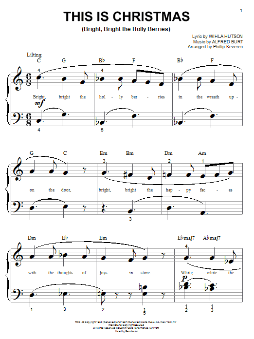 Download or print Wihla Hutson This Is Christmas (Bright, Bright The Holly Berries) (arr. Phillip Keveren) sheet music, chords and digital score arranged for Big Note Piano. This Christmas score includes 2 page(s).