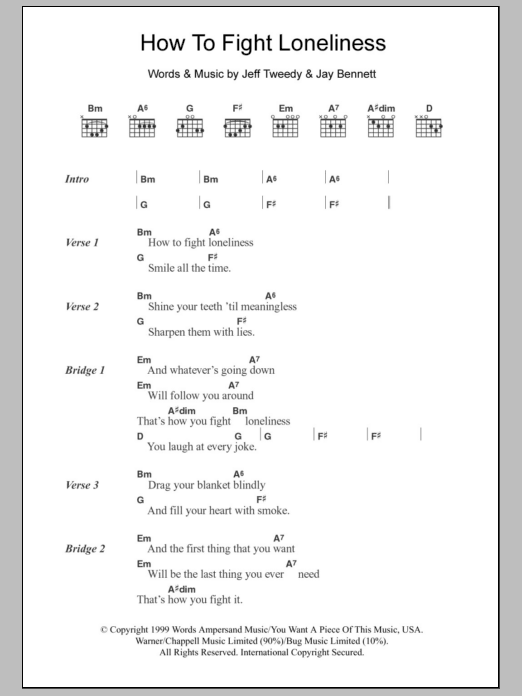 Download or print Wilco How To Fight Loneliness sheet music, chords and digital score arranged for Guitar Chords/Lyrics. This Rock score includes 2 page(s).