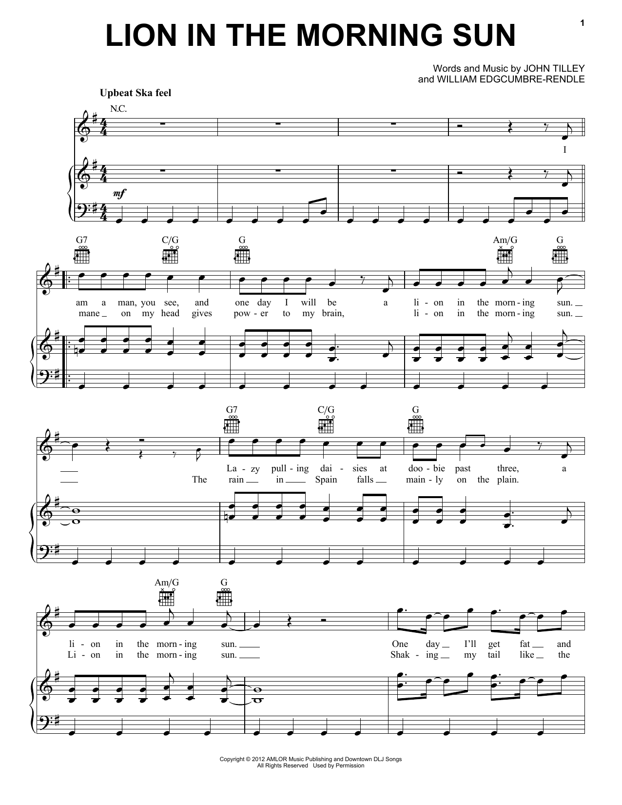 Download or print Will and the People Lion In The Morning Sun sheet music, chords and digital score arranged for Piano, Vocal & Guitar Chords (Right-Hand Melody). This Pop score includes 5 page(s).