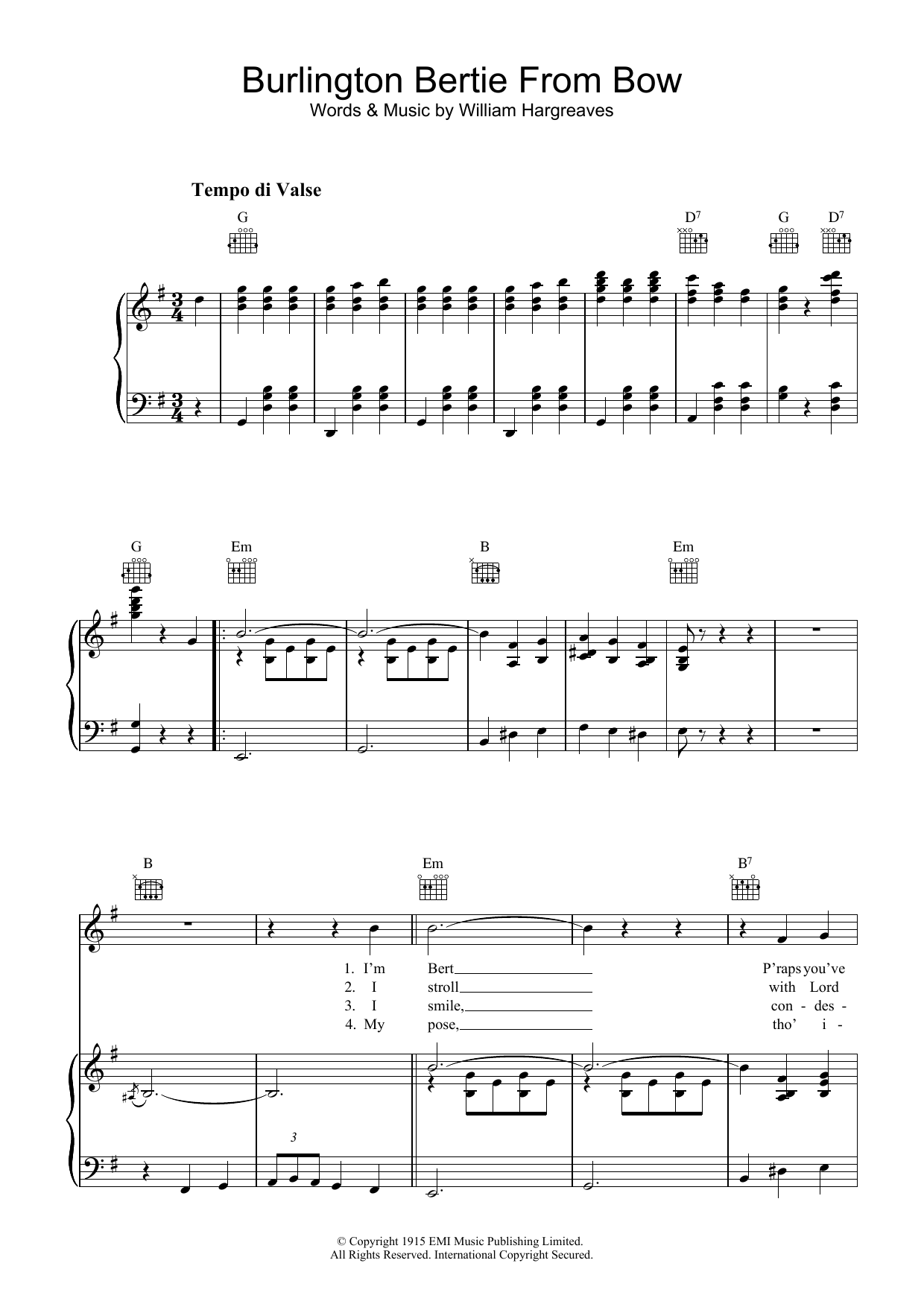Download or print Will Hargreaves Burlington Bertie From Bow sheet music, chords and digital score arranged for Piano, Vocal & Guitar Chords. This Pop score includes 8 page(s).