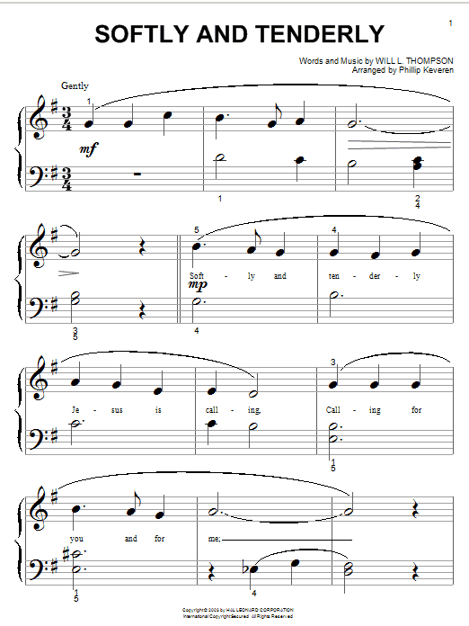 Download or print Will L. Thompson Softly And Tenderly (arr. Phillip Keveren) sheet music, chords and digital score arranged for Beginning Piano Solo. This Christian score includes 3 page(s).