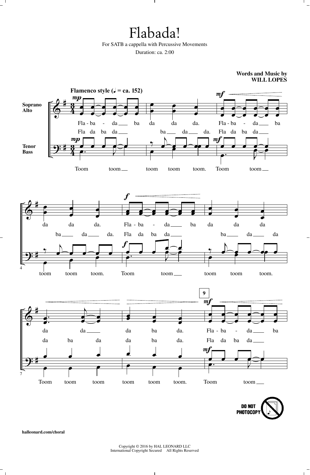 Download or print Will Lopes Flabada! sheet music, chords and digital score arranged for SATB Choir. This Concert score includes 9 page(s).