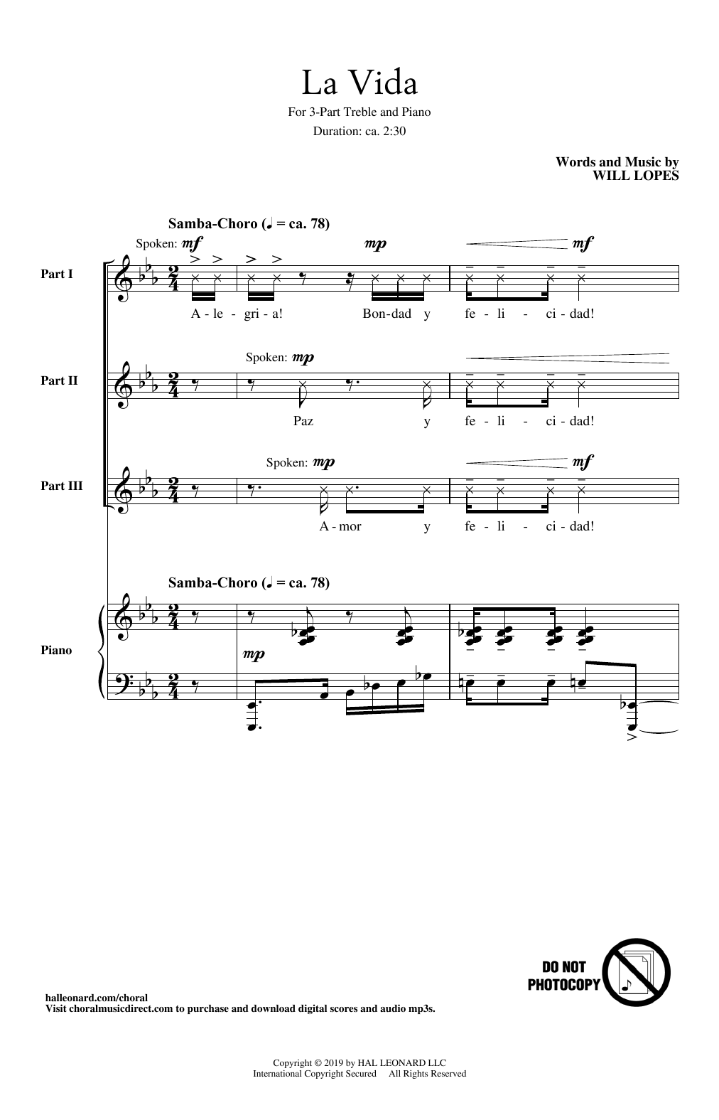 Download or print Will Lopes La Vida sheet music, chords and digital score arranged for 3-Part Treble Choir. This Concert score includes 17 page(s).
