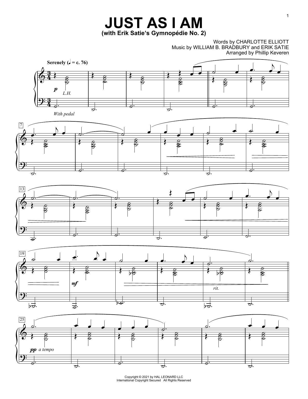 Download or print William B. Bradbury and Erik Satie Just As I Am (With Erik Satie's Gymnopedie No. 2) (arr. Phillip Keveren) sheet music, chords and digital score arranged for Piano Solo. This Sacred score includes 2 page(s).