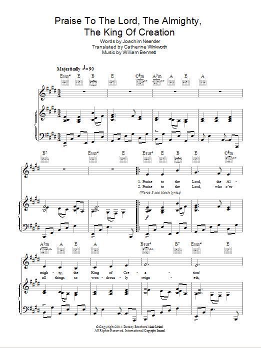 Download or print William Bennett Praise The Lord, The Almighty, The King Of Creation sheet music, chords and digital score arranged for Piano, Vocal & Guitar Chords. This Classical score includes 4 page(s).