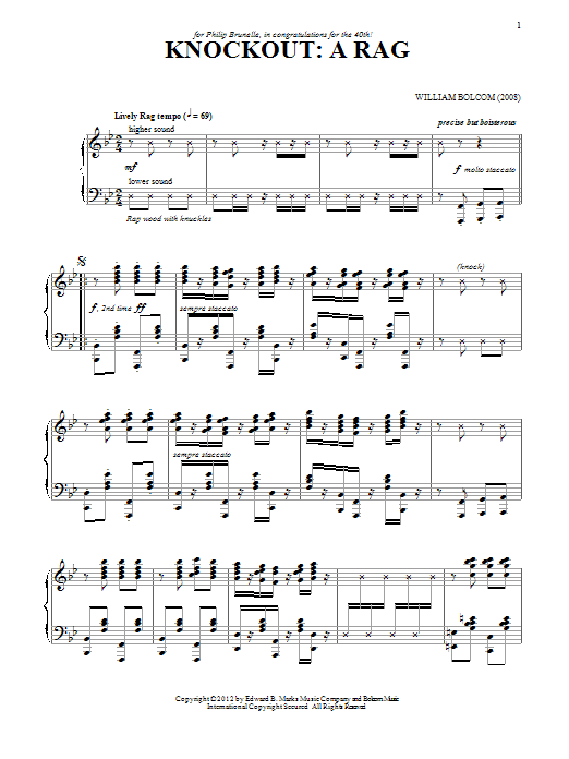 Download or print William Bolcom Knockout: A Rag sheet music, chords and digital score arranged for Piano Solo. This Pop score includes 4 page(s).