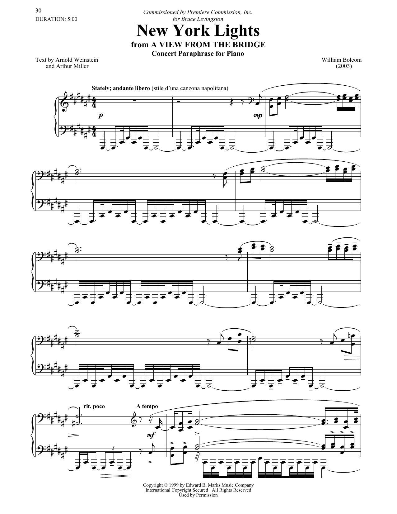 Download or print William Bolcom The New York Lights sheet music, chords and digital score arranged for Piano Solo. This Classical score includes 5 page(s).