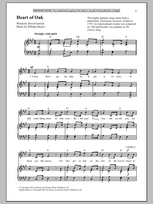 Download or print William Boyce Heart Of Oak sheet music, chords and digital score arranged for Piano & Vocal. This Traditional score includes 2 page(s).
