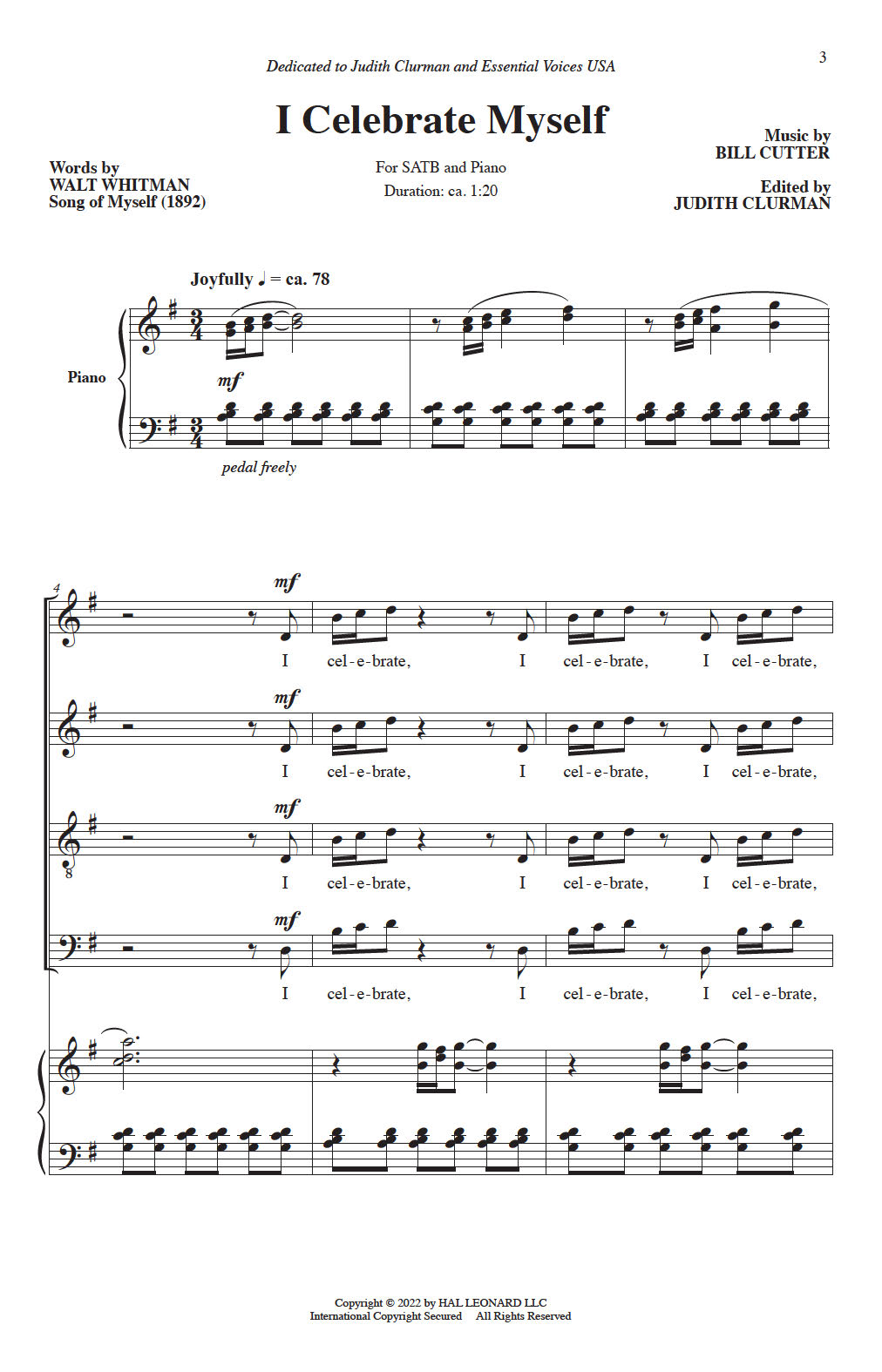 Download or print William Cutter I Celebrate Myself sheet music, chords and digital score arranged for SATB Choir. This Inspirational score includes 7 page(s).