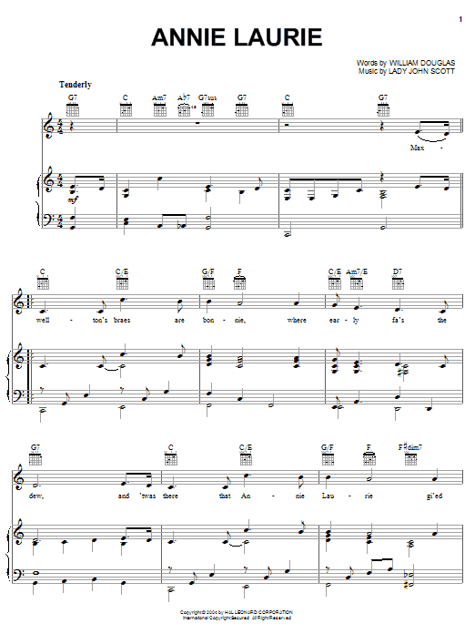 Download or print William Douglas Annie Laurie sheet music, chords and digital score arranged for Piano, Vocal & Guitar Chords (Right-Hand Melody). This Folk score includes 2 page(s).