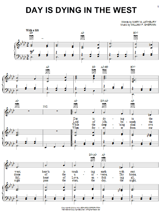 Download or print Mary A. Lathbury Day Is Dying In The West sheet music, chords and digital score arranged for Piano, Vocal & Guitar Chords (Right-Hand Melody). This Inspirational score includes 3 page(s).