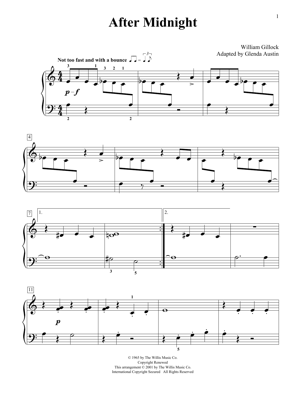 Download or print William Gillock After Midnight (Simplified) (adapted by Glenda Austin) sheet music, chords and digital score arranged for Educational Piano. This Jazz score includes 2 page(s).