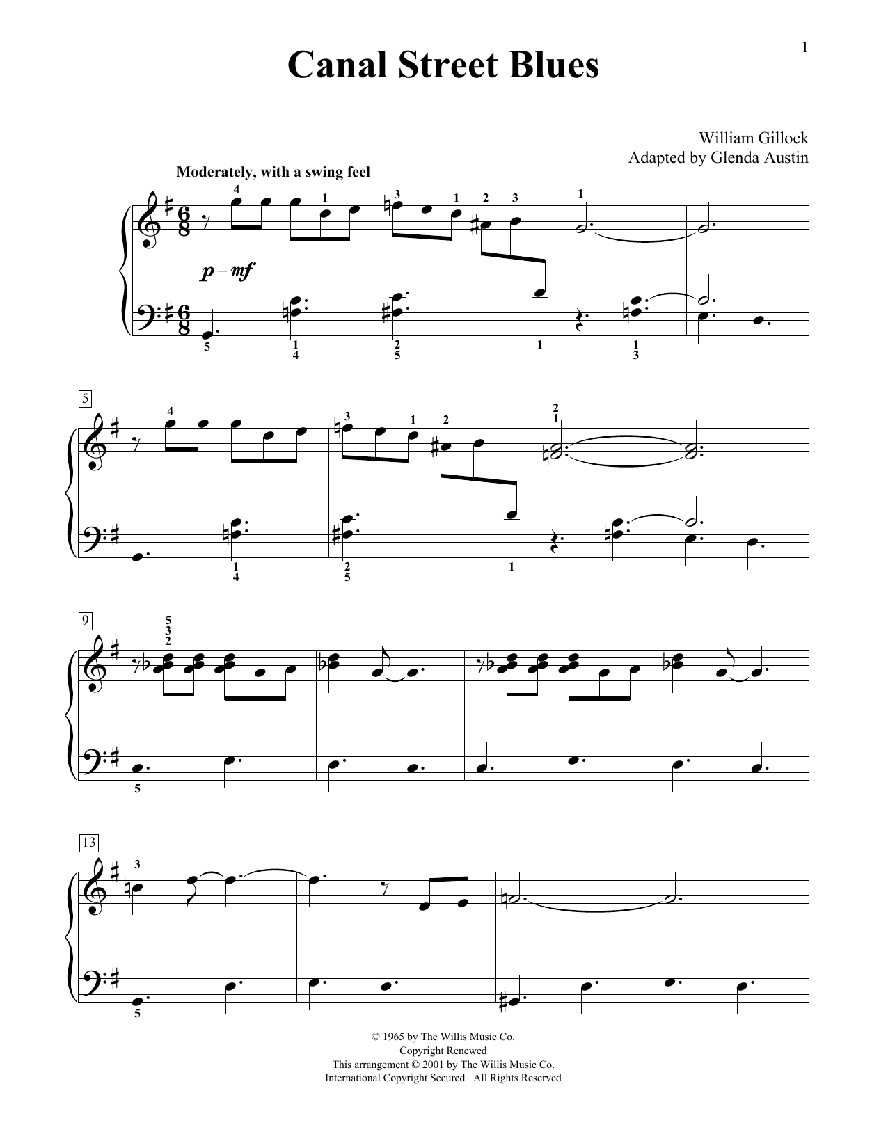 Download or print William Gillock Canal Street Blues (Simplified) (adapted by Glenda Austin) sheet music, chords and digital score arranged for Educational Piano. This Jazz score includes 3 page(s).