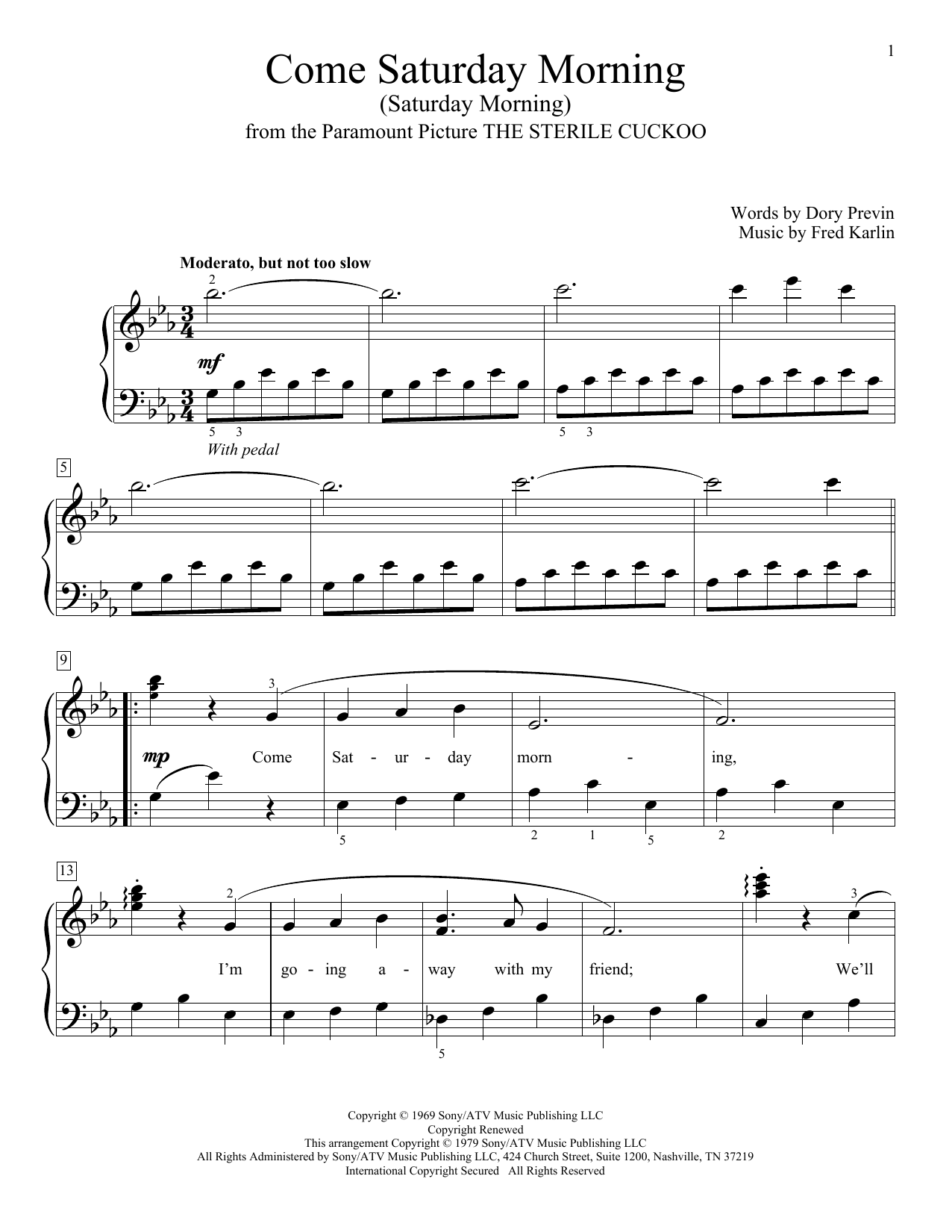 Download or print William Gillock Come Saturday Morning (Saturday Morning) sheet music, chords and digital score arranged for Educational Piano. This Pop score includes 3 page(s).