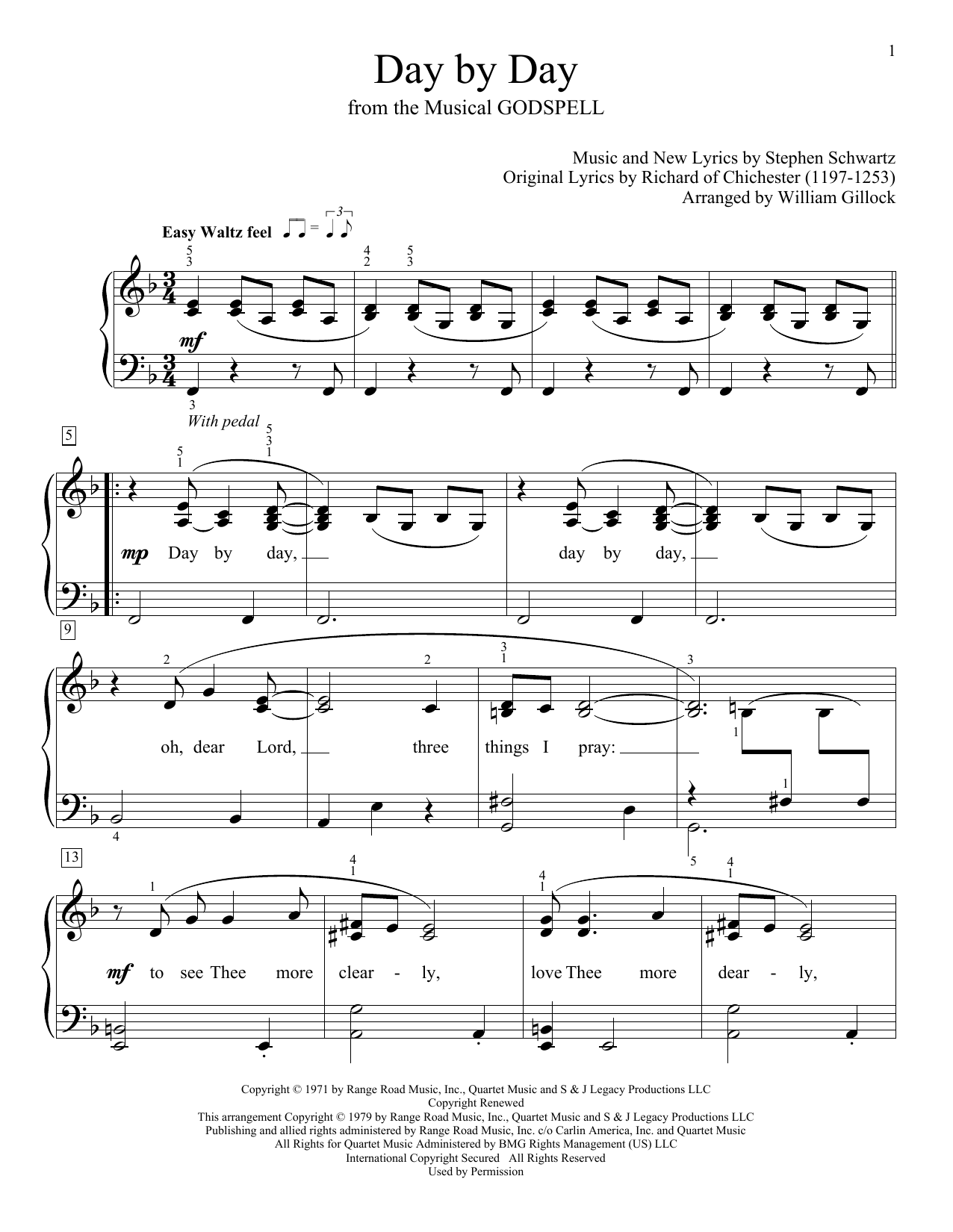 Download or print Stephen Schwartz Day By Day (from Godspell) (arr. William Gillock) sheet music, chords and digital score arranged for Educational Piano. This Pop score includes 3 page(s).