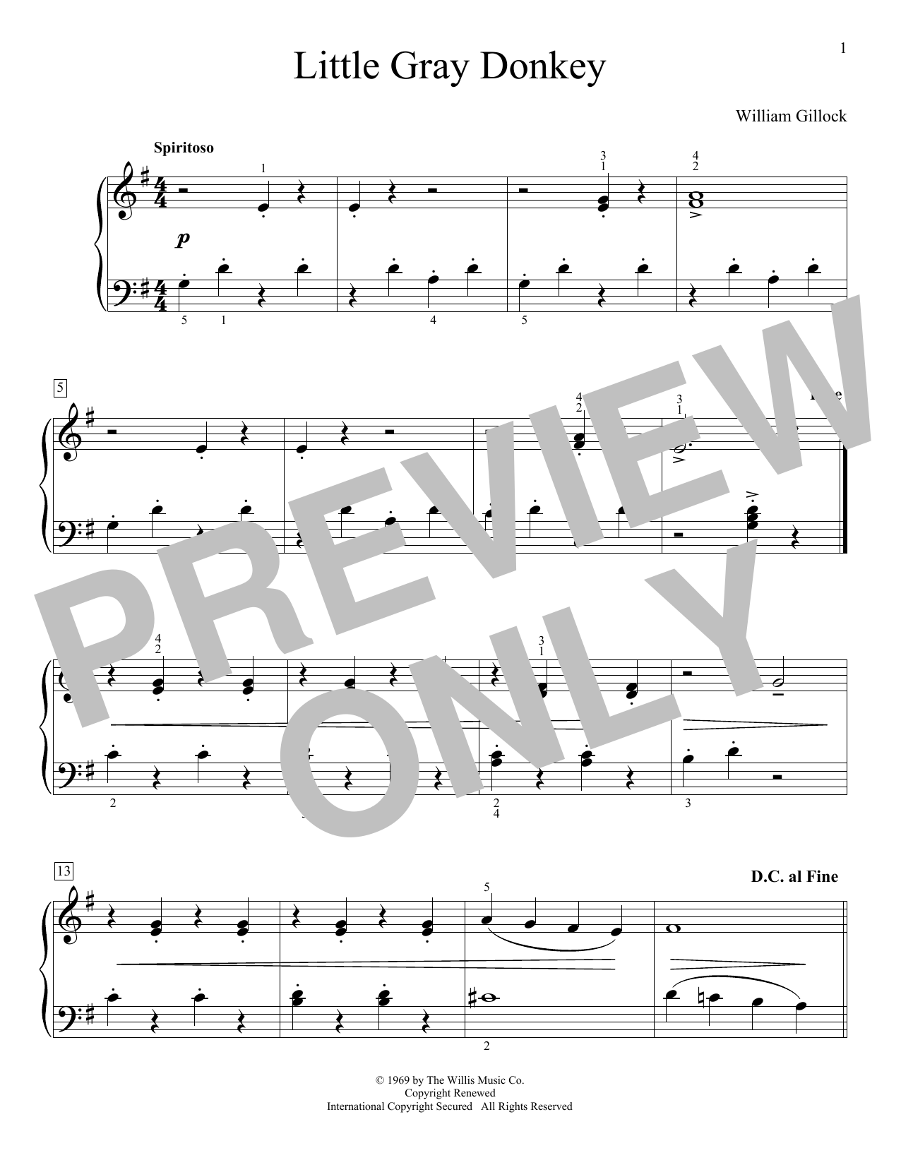 Download or print William Gillock Little Gray Donkey sheet music, chords and digital score arranged for Educational Piano. This Instructional score includes 1 page(s).
