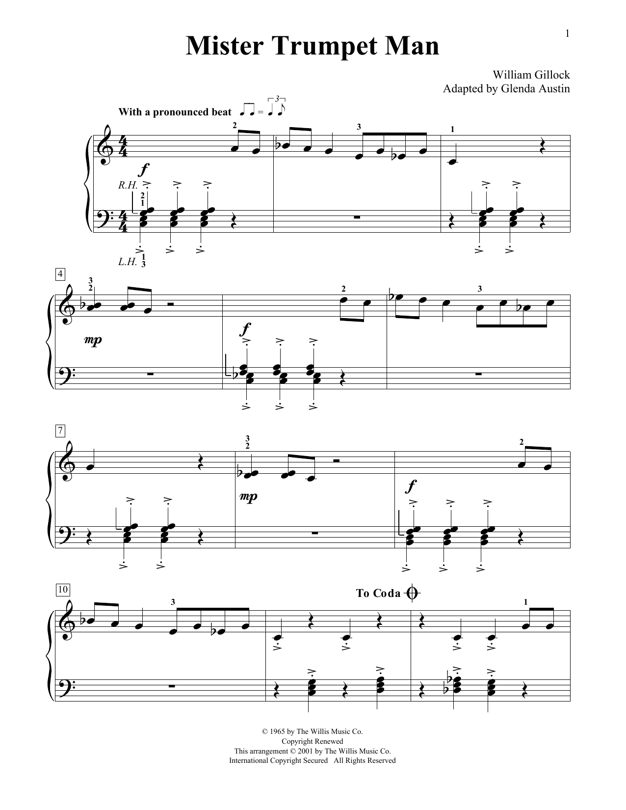 Download or print William Gillock Mister Trumpet Man (Simplified) (adapted by Glenda Austin) sheet music, chords and digital score arranged for Educational Piano. This Jazz score includes 2 page(s).