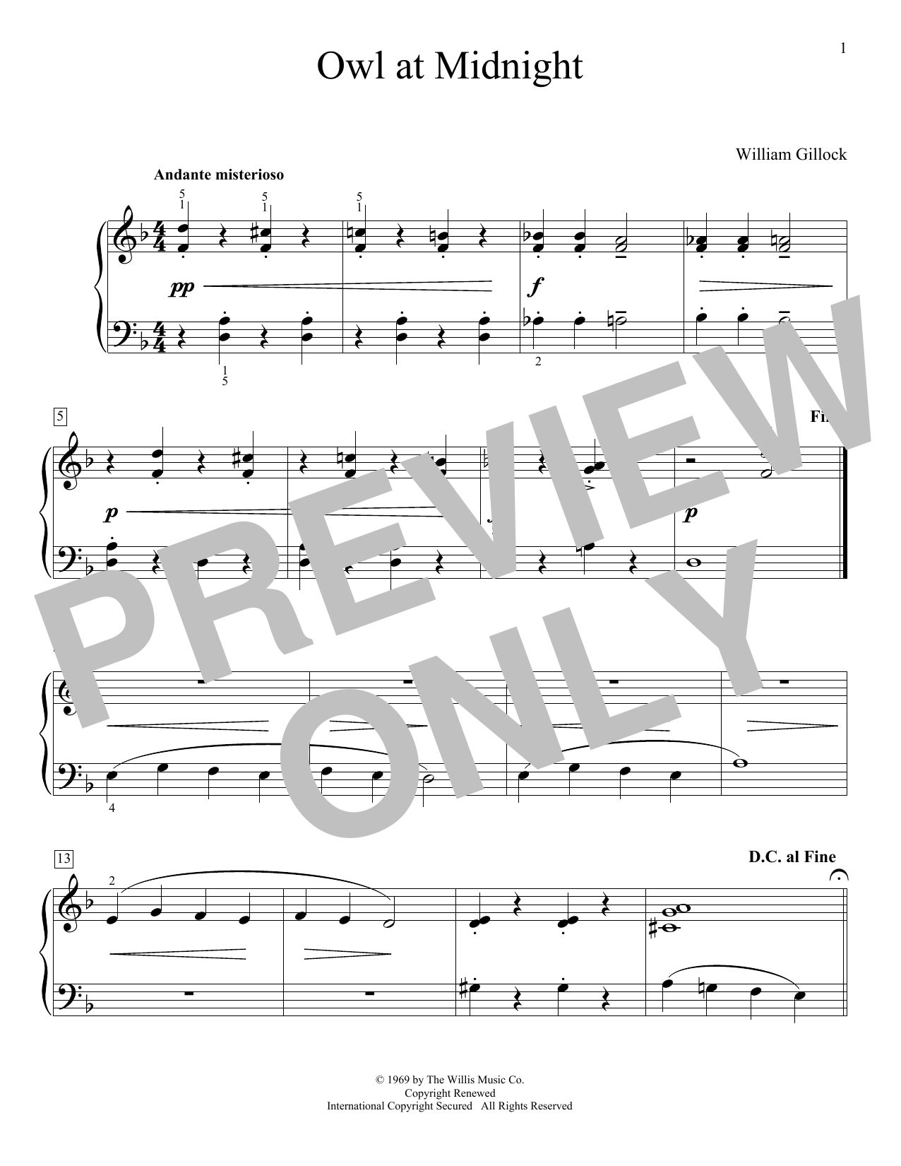 Download or print William Gillock Owl At Midnight sheet music, chords and digital score arranged for Educational Piano. This Instructional score includes 1 page(s).