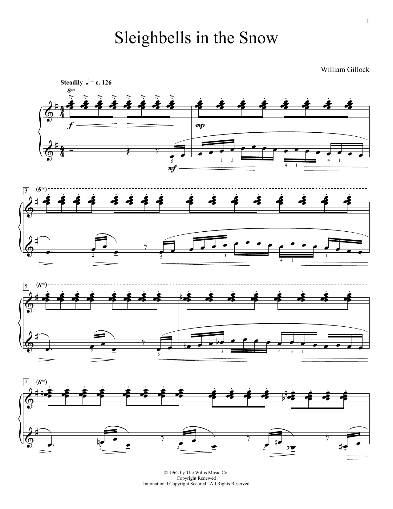 Download or print William Gillock Sleighbells In The Snow sheet music, chords and digital score arranged for Educational Piano. This Instructional score includes 4 page(s).