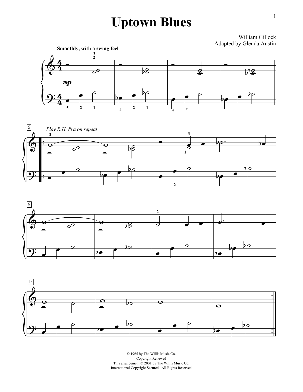 Download or print William Gillock Uptown Blues (Simplified) (adapted by Glenda Austin) sheet music, chords and digital score arranged for Educational Piano. This Jazz score includes 3 page(s).