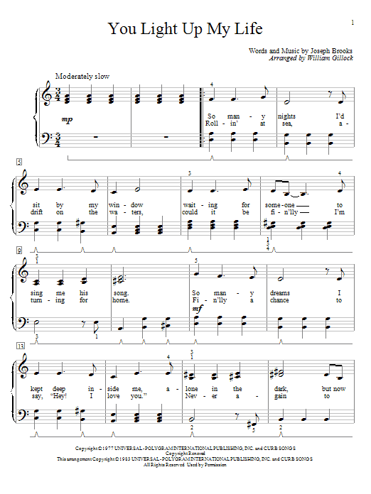 Download or print William Gillock You Light Up My Life (arr. William Gillock) sheet music, chords and digital score arranged for Educational Piano. This Film/TV score includes 3 page(s).