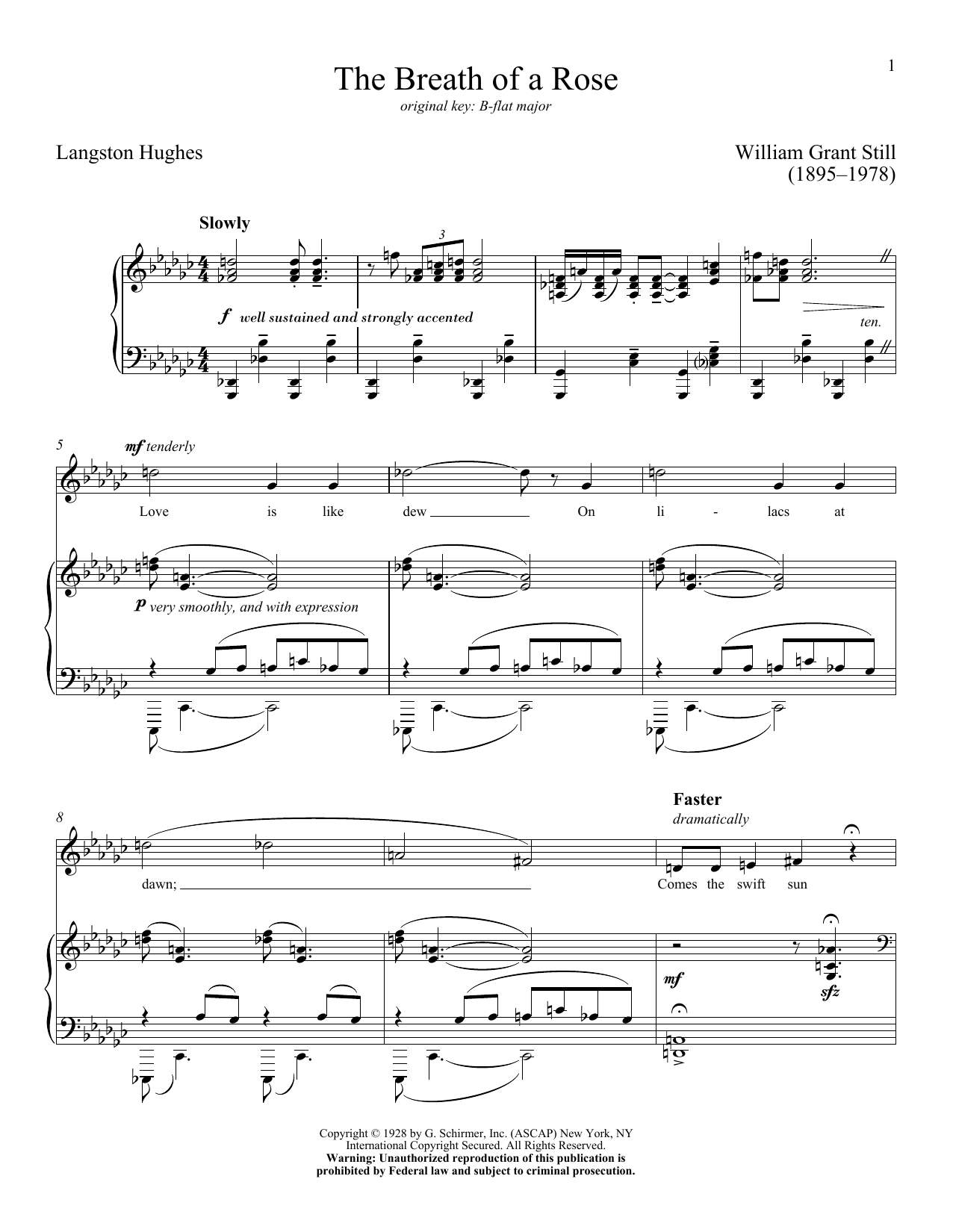 Download or print William Grant Still The Breath Of A Rose sheet music, chords and digital score arranged for Piano & Vocal. This American score includes 4 page(s).