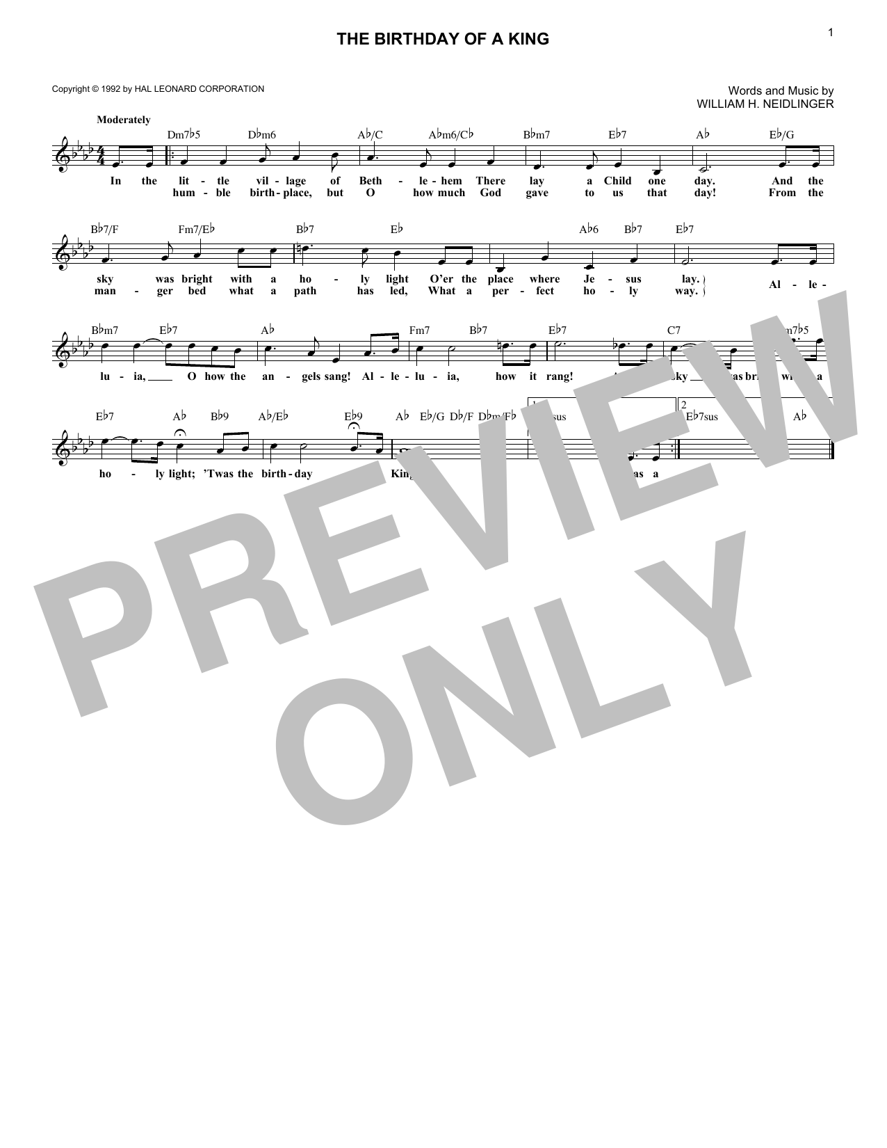 Download or print William H. Neidlinger The Birthday Of A King sheet music, chords and digital score arranged for Lead Sheet / Fake Book. This Christmas score includes 1 page(s).