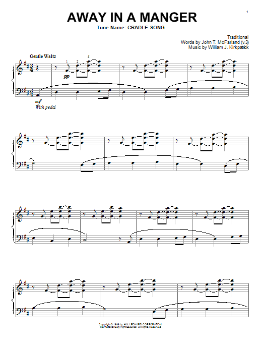 Download or print William J. Kirkpatrick Away In A Manger sheet music, chords and digital score arranged for Piano Solo. This Jazz score includes 3 page(s).