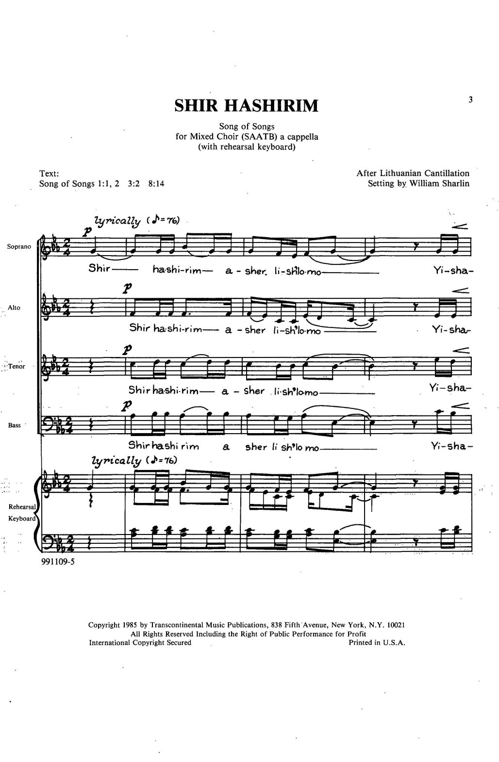 Download or print William Sharlin Shir Hashirim (Song Of Songs) sheet music, chords and digital score arranged for Choir. This Jewish score includes 8 page(s).